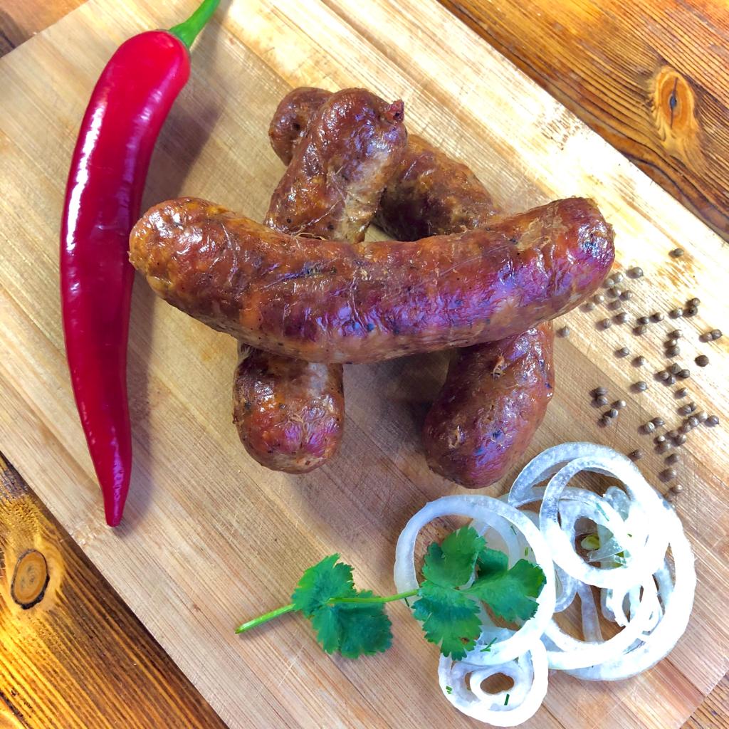 Колбаса домашняя жареная. Колбаски бывают двух видов: куриные и свиные. Рубленное мясо с добавлением пряностей , по специальному рецепту нашего повара забивается в натуральную оболочку.