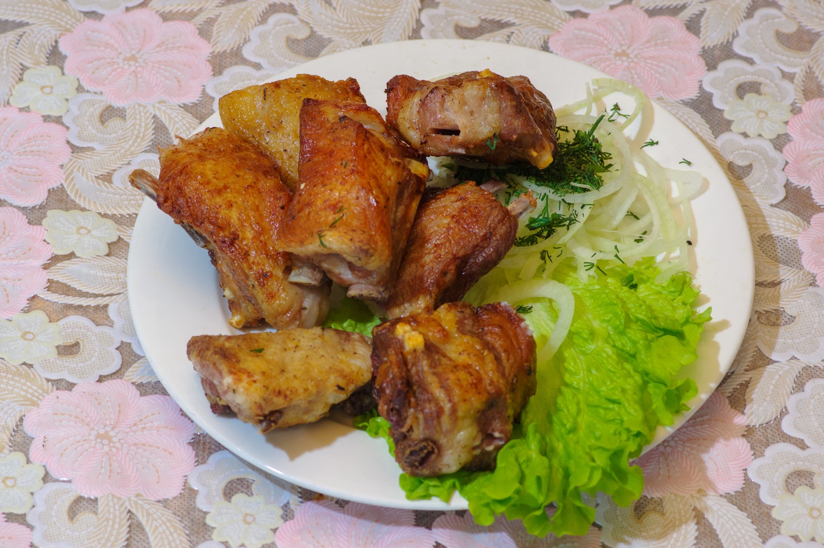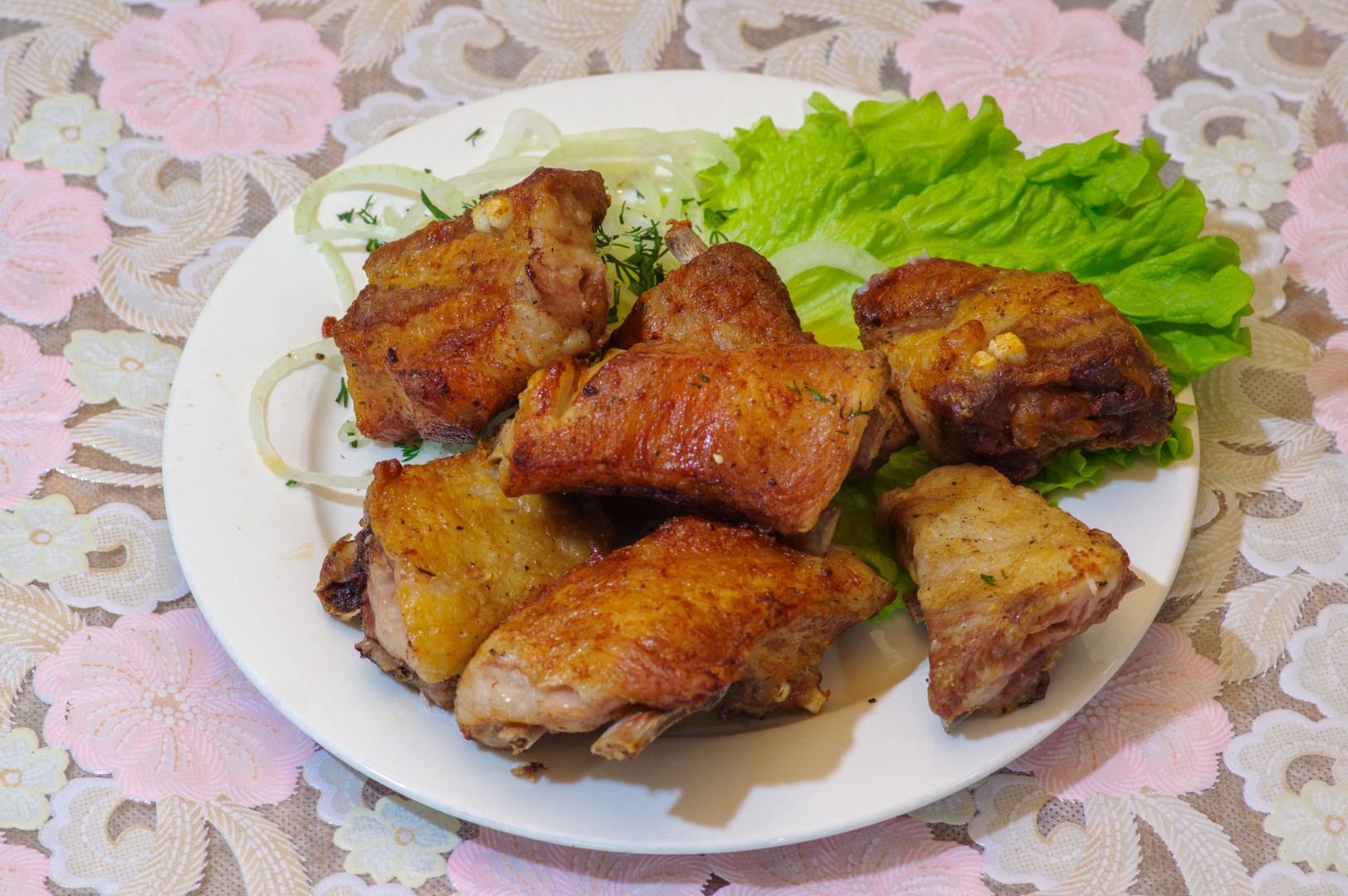 Горячий шашлык из свиных ребрыщек. Маринад приготовлен из лука, зелени и пряностей для маринования свинины, также по желанию гостей используем сухое вино, смесь свежевырытых соков из фруктов – яблок, томатов, гранатов. Шашлык жарит на углях профессиональный шашлычник с огромным опытом.
