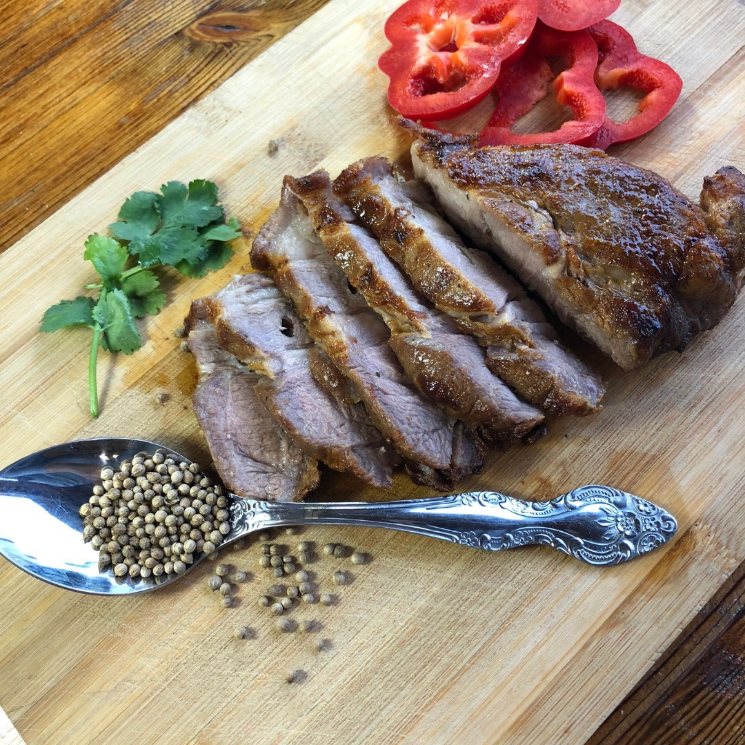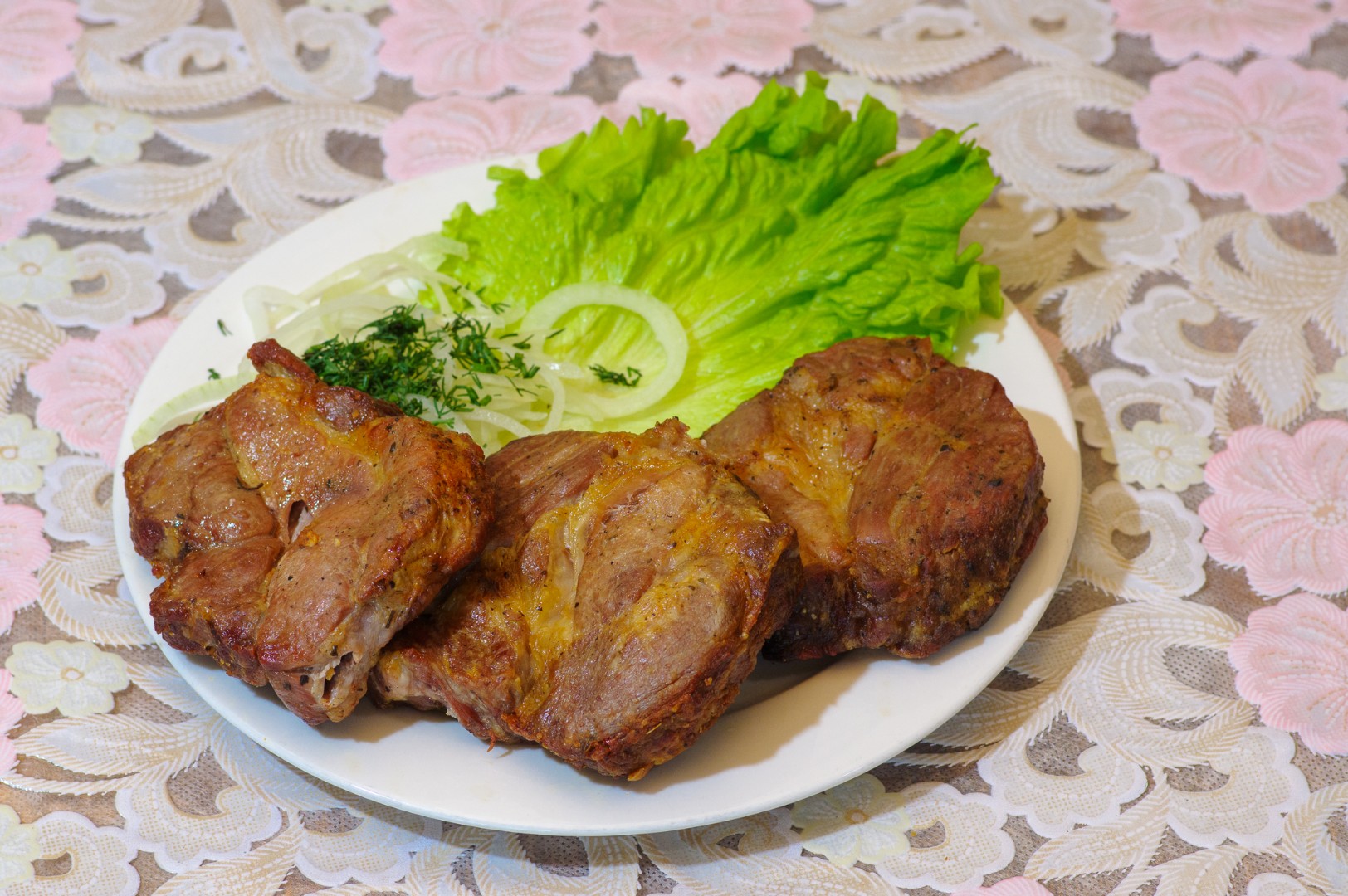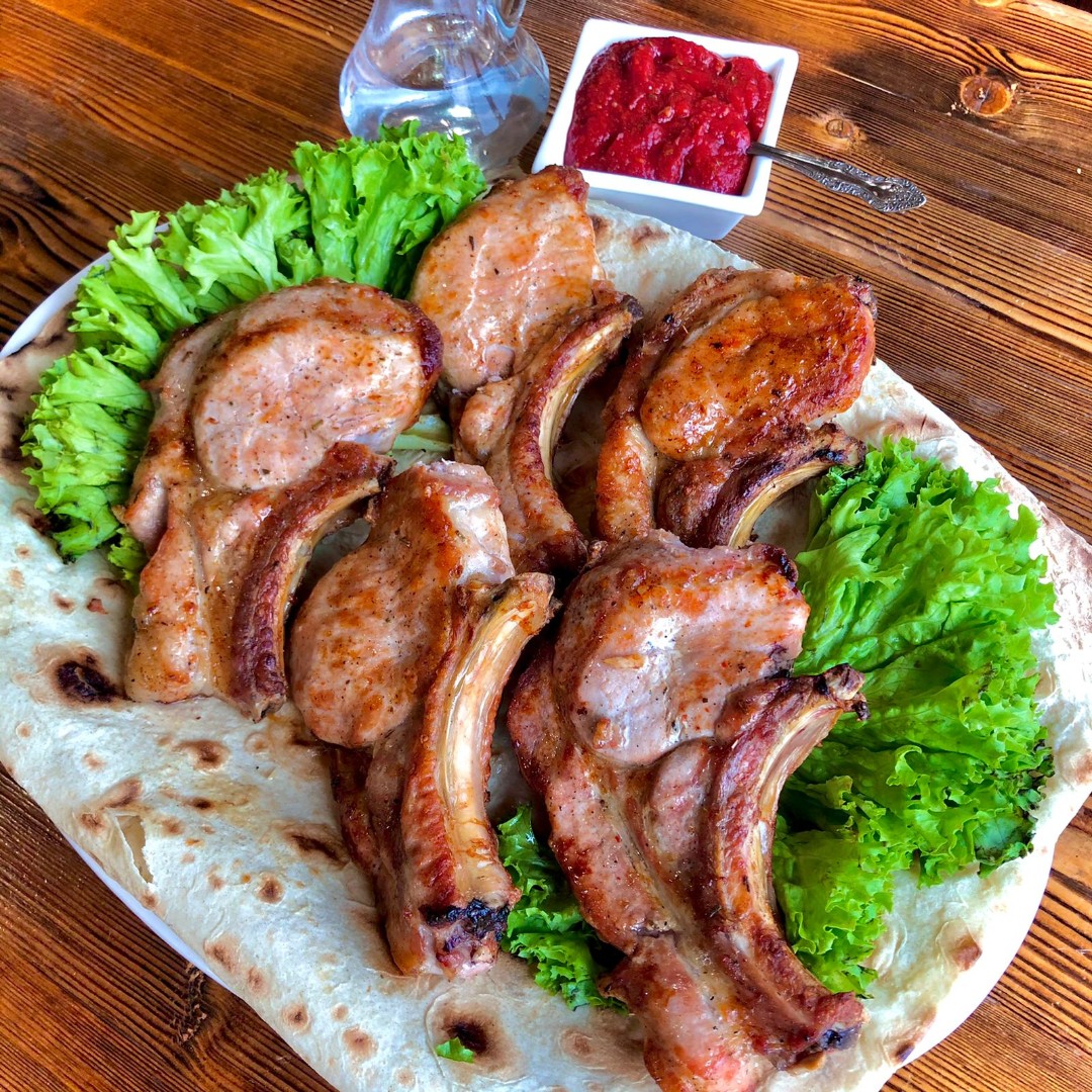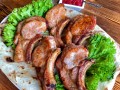 Горячий шашлык из свиной корейки. Маринад приготовлен из лука, зелени и пряностей для маринования свинины, также по желанию гостей используем сухое вино, смесь свежевырытых соков из фруктов – яблок, томатов, гранатов. Шашлык жарит на углях профессиональный шашлычник с огромным опытом.