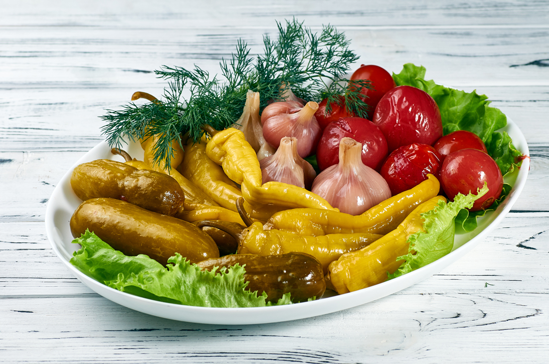 Состав: маринованные огурцы, помидоры, острый перец (цицак), цветная капуста, чеснок. Порция - 200 гр.