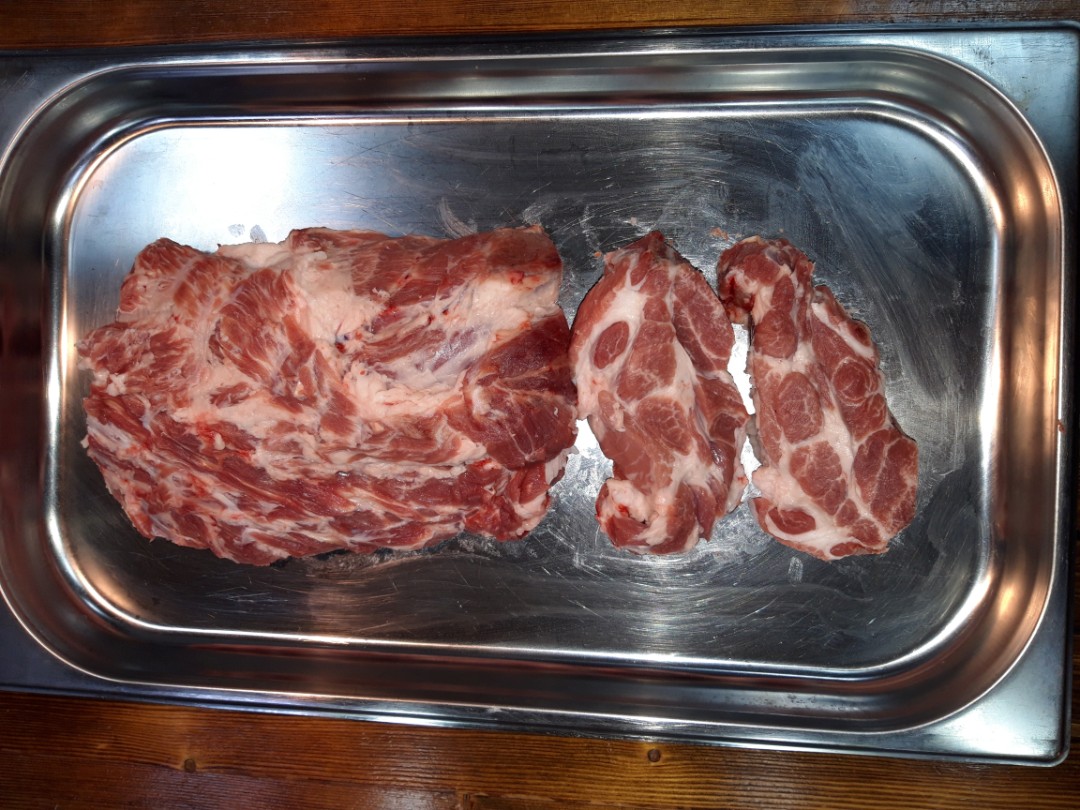 Свинина выращена в деревне (деревенская) у наших постоянных поставщиков. Каждый наш поставшик использует для откорма свиньи натуральный корм (ячмень,пшеница,кабачки,тыква,сахарная свёкла,гречневая каша), без химии.
